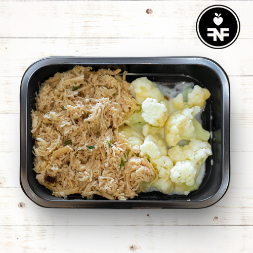 Lombo suíno, couve flor, queijo parmesão, leite desnatado , farinha de arroz, cebola, alho, manteiga, sal, noz moscada, cebolinha, pimenta do reino e azeite.