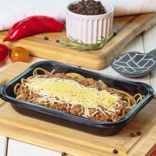 Macarrão 100% integral, tomate, manjericão, sal, pimenta-do-reino, alho, azeite e carne bovina magra.